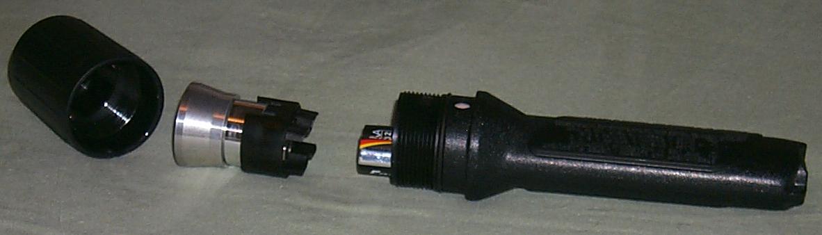 The light has a bezel shroud with plastic window, reflector/emitter assembly, batteries, and body. The rear switch area of the light does not detach.